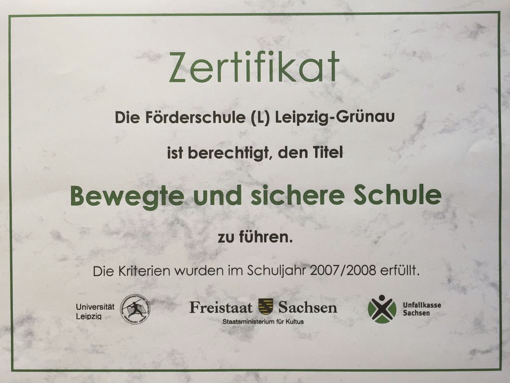 Unsere Schule erhielt im Jahr 2007/2008 das Zertifikat „Bewegte und Sichere Schule“ und 2011/2012 das Zertifikat „Bewegte Schule – Partner für Sicherheit“.